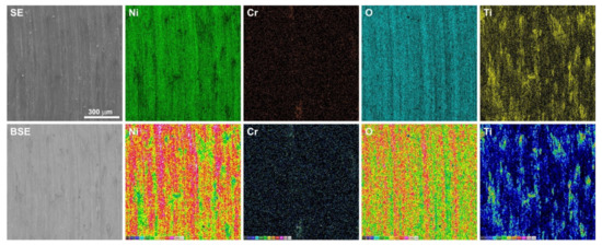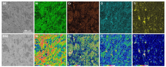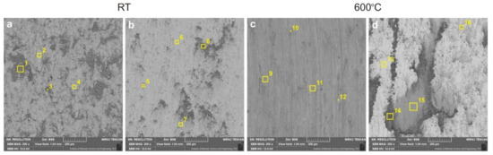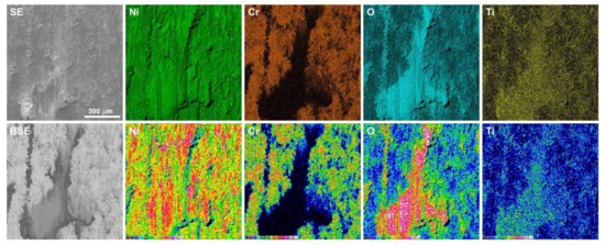 Figure 6, Figure 7, Figure 8 and Figure 9 show the results of microscopic observations of the wear surfaces of both nickel sinters with TiO2 and counter-samples. The surface of the sinters after the friction wear test at room temperature is very developed (Figure 6a,b and Figure 7a–e). The main wear mechanism of the sinter tested at 23 °C is abrasion and ploughing. Moreover, a significant amount of worn debris is visible, in the form of black particles (Figure 6a,b). The SEM pictures taken in the backscattered electrons contrast (BSE) additionally show the areas of TiO2 located in the sinter. The surface appearance is different after the friction wear test at the temperature of 600 °C. In the LM image (Figure 6c,d) regular scratches are visible, and the surface has a regular blue-gray color. SEM observations (Figure 7g,h) at higher magnifications show slight delamination of the outer sinter surface layer. In BSE contrast, an almost uniform gray color of the surface is visible, which indicates the formation of a lubricating film on the surface. Areas with a lighter shade of gray are characterized by a smaller thickness of the tribofilm. The amount of worn debris is minimal, which is confirmed by the relative mass losses. The results of the observation of the counter-sample surface after the wear test at 23 °C are shown in Figure 6e,f and Figure 8. On the worn surface, a significant amount of worn debris was observed. The BSE image shows dark-colored worn debris corresponding to titanium dioxides, and worn debris with no considerable difference in color, which are wear products from sinter and Inconel®625. The ploughing and cutting are noted on the wear tracks of Inconel®625. In addition, smeared worn debris and–in some places–micro-polishing are visible. On the surface of the counter-sample, after testing at the temperature of 600 °C Figure 6g,h and Figure 9), micro-cutting and micro-polishing are visible. Observations in BSE contrast show the smearing of TiO2 on the worn surface. This is clearly visible in the form of darker shades of gray. The worn surface is smoother than the worn surface of Inconel®625 when tested at room temperature. In the wear track, there are also areas indicative of ploughing. The wear pattern also shows ploughing areas that were formed in the initial stage of the test, i.e., during the grinding-in period.