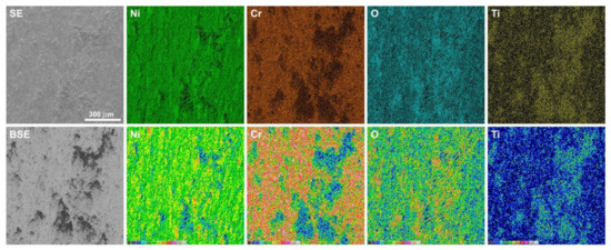 EDS maps of element concentration distributions on the Inconel®625 surface after friction wear test at room temperature.