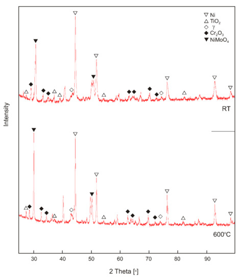 The study of the chemical composition of EDS (Figure 10, Figure 11, Figure 12, Figure 13 and Figure 14, Table 1) confirmed the formation of tribofilm on the surface of the sinters at the test temperature of 600 °C. On the sinter surface after wear test at room temperature (to 7.5 wt.%), an increased content of chromium was observed compared to the content of chromium on the worn surface at temperature of 600 °C (0.1 wt.%). This proves that the counter-sample had a significant role in the friction and abrasion process. Titanium was observed on the whole surface of the sinter, but mainly in loose TiO2 particles and anchored in the matrix. On the surface of the sinter tested at the temperature of 600 °C, the smearing of TiO2 is clearly visible. The distribution of titanium concentration and the quantitative analysis show the different thickness of the tribofilm formed during the wear test. The titanium content was between 0.5 and 3.8 wt. %. The distributions of the concentrations of elements on the surfaces of the counter-samples depending on the test temperature are shown in Figure 12 and Figure 13. The result of the quantitative analysis is presented in Table 1. Based on the SEM observations and EDS maps, as well as the quantitative analysis, it was found that for the counter-samples at room temperature after the wear test, TiO2 is present in its original form, i.e., nanoparticles and agglomerates. The formation of tribofilm in some places in the wear track was confirmed on the worn surface of the Inconel®625 alloy after the test at 600 °C. For this counter-sample, an increased content of nickel and oxygen is observed in the areas where there is also an increased content of titanium. It proves the smearing of the sintered material in the wear track, the release of TiO2 nanoparticles, and further formation of a tribofilm. Based on the XRD tests (Figure 15), it was found that during the testing of the Ni-10 wt.% TiO2—Inconel®625 friction pair at room temperature on the sinter surface, apart from the original components (TiO2, Ni), there is also the presence of phases composed of elements derived from the counter-specimen material, such as Cr2O3, NiMoO4 and γ. A similar phase composition was found on the sinter surface after the friction wear test at the temperature of 600 °C. In the case of Cr2O3 and NiMoO4 oxides, there is a slight shift of the peaks towards the lower angles. This can probably be attributed to a lower coefficient of friction, which leads to less local deformation caused by stress and thus to larger d-spacing of the crystal structure compared to sinter tested at room temperature. Figure 16 and Table 2 show the results of tests of worn debris. Based on the SEM observations and EDS tests (Figure 16a–d, Table 2), it was found that the worn debris for the friction pair tested at 23 °C were loose Inconel®625 particles and oxide particles. The particle size of the worn debris is as high as 200 µm. In case of a friction pair tested at 600 °C, the particle size is about 10–20 µm and they contain mainly nickel, titanium, and oxygen. This proves the low wear of counter-sample in this case. It should be noted that the wear of the sinter is low, which was confirmed by the relative mass losses test.