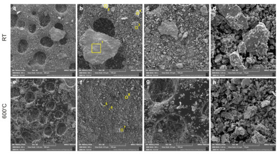 Worn debris, test temperature 23 °C (a–d), 600 °C (e–h).