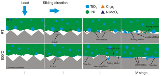 Based on the results, the wear mechanism of the Ni-10 wt.% TiO2—Inconel®625 friction pair was proposed (Figure 17). This mechanism can be divided into four stages. The first two stages were the same at the test temperature of 23 °C and 600 °C. In the initial stage, grinding-in occurs. The unevenness of the surface of counter-samples and sinters are sheared, and TiO2 nanoparticles are released. In addition, the surface of Inconel®625 was oxidized, and Cr2O3 and NiMoO4 oxides were formed and then removed during successive rotations of the pin on the disc and were part of the worn debris. After their removal, the surface was re-oxidized. The presence of these oxides was confirmed by XRD analysis. Then, the worn debris are crumbled into smaller particles followed by the further release of TiO2 particles from the sinter. In both tested temperatures, the process of mending the surfaces by filling the grooves with oxide is observed. In the case of the friction wear test at room temperature, in the third and fourth stages, two interactions of TiO2 nanoparticles are observed—some of them behave like balls in a rolling bearing, and some of them slide on the surface. However, there is no formation of tribofilm. The oxide particles together with other worn debris cause cutting, ploughing, and in some areas, polishing of the surfaces of the friction pair. Moreover, some worn debris are smeared on the friction pair surfaces, and further release of TiO2 occurs. In case of a friction pair operating at a temperature of 600 °C, the formation of a tribofilm composed of titanium oxides in the third stage and the continuous release of oxides from the particles of sinter smeared on the surfaces of the friction pair is observed. In addition, some of the TiO2 oxides and the Cr2O3 and NiMoO4 oxides formed during friction may be responsible for the rolling and sliding effect between the surfaces of the friction pair, which causes their micropolishing. In the fourth stage, tribofilm of various thickness and containing high dispersion worn debris is formed on the surface of the sinter. The proposed wear mechanism will allow for a better understanding of the phenomena occurring during the frictional operation of the Ni-10 wt.% TiO2 sinter—Inconel®625 friction pair and may be transferred to other pairs operating under dry friction conditions in the presence of TiO2.