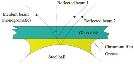 The film thickness was measured by the two-beam interference method, as shown in Figure 2. During the experiment, the steel ball comes into contact with a chrome-coated glass disc, forming a Hertz contact region by applying a load. Due to the half transmitting and half reflecting characteristic of the chromium metal film on the surface of the glass disc, the incident light is reflected at different locations. Part of the beam is reflected on the chrome film surface, named the reflected beam 1 in Figure 2, while the other part of the beam is reflected on the grease-filled steel ball surface, named reflected beam 2 in Figure 2. There is a distance between the two reflected beams, and this difference is the value of oil film thickness. Since the incident beam is monochromatic, the two reflected beams have the same frequency and interfere. The film thickness and shape in the contact region can be obtained through analyzing the collected interfering beams by the optical system.