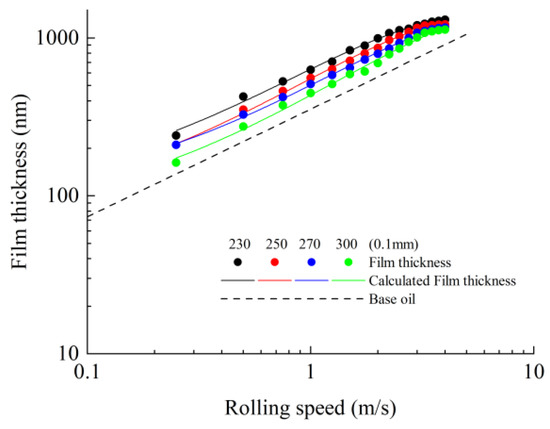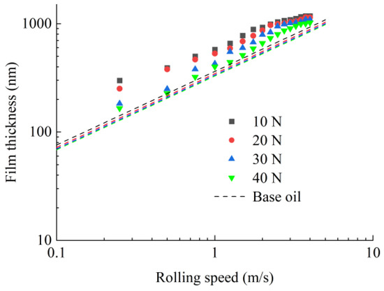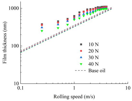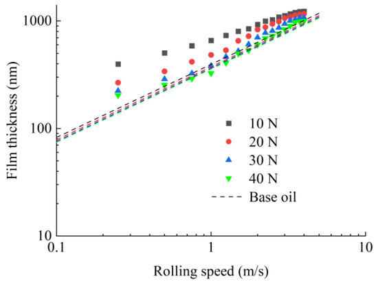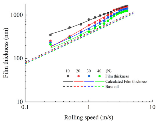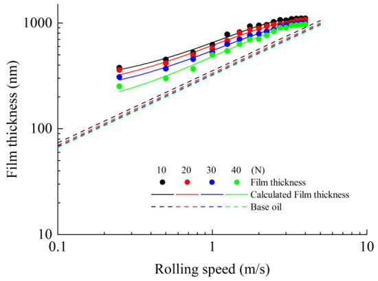 In this paper, the film thickness measurements were carried out at the temperature of 25 °C in nominal pure rolling. Sixteen rolling speed parameters were selected: 0.25 m/s, 0.50 m/s, 0.75 m/s, 1.00 m/s, 1.25 m/s, 1.50 m/s, 1.75 m/s, 2.00 m/s, 2.25 m/s, 2.50 m/s, 2.75 m/s, 3.00 m/s, 3.25 m/s, 3.50 m/s, 3.75 m/s and 4.00 m/s. A total of 4 normal contact load parameters were selected: 10 N, 20 N, 30 N, and 40 N, and the corresponding contact pressures are 0.41 GPa, 0.52 GPa, 0.59 GPa and 0.65 GPa.