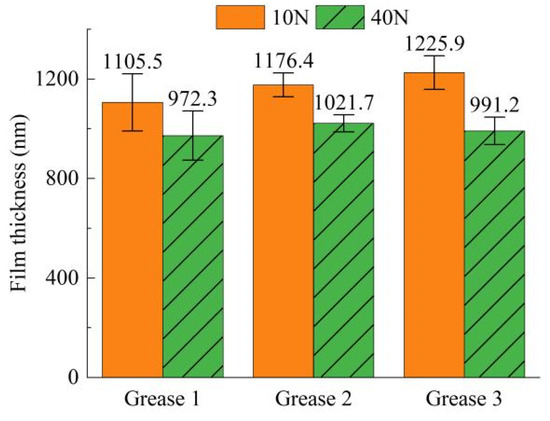Figure 3, Figure 4 and Figure 5 show the film thicknesses of Grease 1, Grease 2, Grease 3 and their base oils versus rolling speed under fully flooded lubrication. The grease film thickness increases with the increase in rolling speeds under the constant normal contact load, but the growth rate of grease film thickness decreases with the increasing rolling speeds. It also can be seen that the grease film thickness decreases with the increasing normal contact loads when the rolling speed is constant. Even if the load increases exponentially, the grease film thickness changes slightly. When the rolling speed is 4 m/s and the normal contact load is 10 N and 40 N, the maximum and minimum values of grease film thickness were obtained, as shown in Figure 6. The maximum/minimum film thicknesses of Grease 1, Grease 2 and Grease 3 are 1105.5 nm/972.3 nm, 1176.4 nm/1021 nm, and 1225.9 nm/ 991.2 nm, respectively.