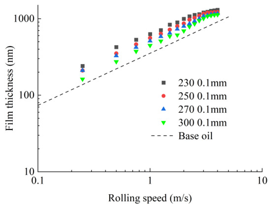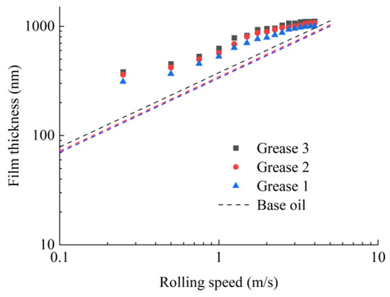 The properties of the bleed oils differ hardly from those of the base oils in the high-speed regions [12], so the grease film thickness can be mainly determined by its base oil. Figure 9 indicated the influence of base oil type on the grease film thickness, and there is a slightly difference in grease film thickness whose thickeners are the same. Gunsel [27] pointed out that the larger the atmospheric viscosity and pressure-viscosity coefficient, the higher the oil film thickness in fully flooded elastohydrodynamic lubrication. The atmospheric viscosities of the three base oils used in this paper are same. The pressure-viscosity coefficients of PAO oil, ester oil and mineral oil are 1.7 × 10−8 Pa−1, 1.85 × 10−8 Pa−1 and 2.21 × 10−8 Pa−1, respectively. Therefore, the film thickness of mineral oil is the largest, followed by ester oil, and the smallest is PAO oil. The pressure-viscosity coefficients of the three base oils are close, so the oil film thickness is also close. The film thickness of Grease 3 is the largest, followed by Grease 2, and the smallest is Grease 1 as shown in Figure 9, which results from the film thickness of mineral oil being the largest, followed by ester oil, and the smallest is PAO oil.