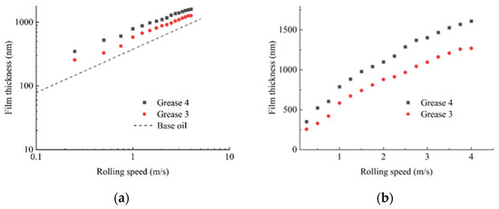 Effect of thickener type on grease film thickness (a) logarithmic coordinate system (b) linear coordinate system.