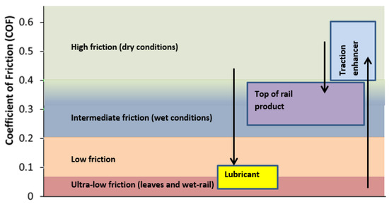 Top-of-rail (TOR) products, designed to decrease the friction coefficient from high levels and maintain it at an intermediate level; if the friction coefficient is too low it will negatively affect traction and breaking and if it is too high then excessive wear or rolling contact fatigue may occur. A review of their use and effects can be found in [1].