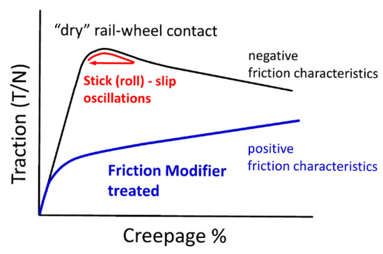This intermediate region (0.3–0.4) is different to that described in Figure 1 (0.2–0.4). Different rail networks specify different friction requirements [2] and these are dependent on contact conditions, so these conditions should be viewed as a guide rather than absolute values. The desired creep curve behaviour of TOR products is shown in Figure 2 [5].