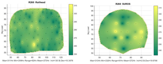 Hardness map taken from a sectioned R260 rail head and rail disc [16].