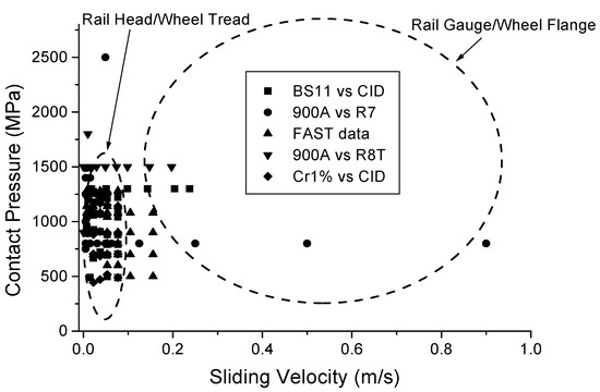 For a top-of-rail product, the values representative of a wheel tread/rail head contact should be used. Contact stress and slip values should be representative of the railway system under consideration, for instance:
