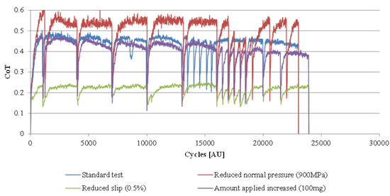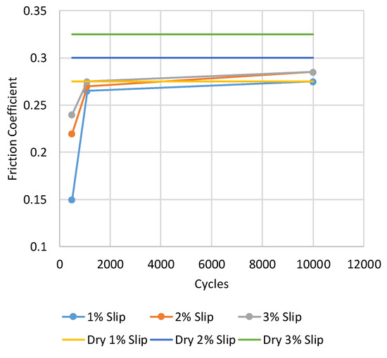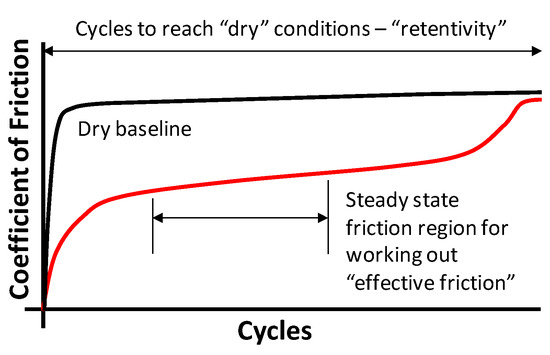 Intermediate friction levels have been defined as being between 0.2 and 0.4—these thresholds should not be considered as clear cut, as if testing in the partial slip region (up to around 1–2% slip), friction levels may be lower. An example of this creep curve is shown in Figure 2. During a “retentivity”, test friction will vary, but with all products there will be a steady state region where “effective friction” can be determined. It may also be appropriate to define the number of cycles a product is in the intermediate regime. This means that for different products tested, a number of parameters can be considered in ranking their performance.