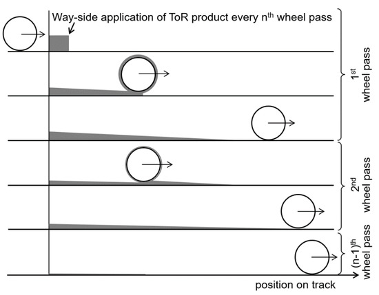 TOR products are frequently over-applied in experimental work. Amounts should be scaled to take account of the smaller contact sizes being used in the tests. It is relevant to look at different amounts as carry-down mechanisms mean that the amount of product on the rail head changes with distance from the application point (see Figure 9 [23]). Another issue is the misapplication of water-based TOR-FMs. They are designed to work by forming a dry third-body layer made up of the solid component mixed with the oxides naturally present in the wheel/rail interface. In most studies they are applied wet to the contact and therefore only the application point is simulated. In the methods described here, the product dries out and forms a steady state layer before being consumed as the contact returns to dry conditions.