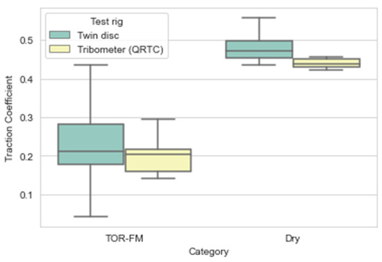 Comparison of laboratory friction data with field data is very important. However, most methods for field measurement involve the use of a tribometer to measure friction between the tribometer “wheel” or “slider” and may not be representative of what is achieved in a wheel/rail contact, for instance due to the lack of the previously described third body layer. Figure 11a shows a comparison of data from a range of different measurements [24]. Most rail head friction measuring devices, including the pendulum device and the push-tribometer, provide a poor representation of wheel/rail interface conditions. However, the data in Figure 11b show that for TOR-FM measurements the pendulum device does give results similar to a full-scale rig [24].