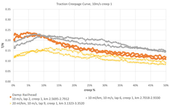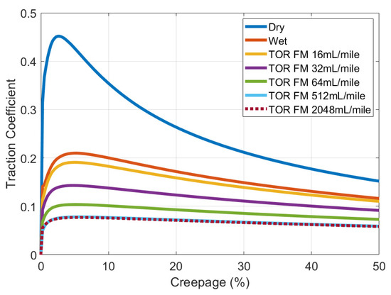 Scaling data from a small-scale test to a full-scale contact is complex. The best approach to achieve this is to use small-scale data to parameterise a creep force model which can then be used for predictions of field behaviour. This has been performed for a TOR-FM using data from High Pressure Torsion tests [26] and the extended creep force (ECF) model. The predictions for full-scale contacts are shown in Figure 14. These compare well with locomotive data shown in Figure 13 (where the “damp” curve in rainy conditions compares well to the “wet” curve in Figure 14). The 16 and 32 mL/mile dosages modelled here are equivalent to the 10 and 20 mL/km dosages used in the track trials.