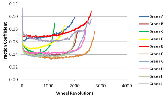 There are no thresholds defined for “retentivity” so it can only really be used for comparisons between products. However, previous twin disc testing on different greases to study retentivity has shown that the test approach can resolve differences between different products [19], as can be seen in Figure 15.
