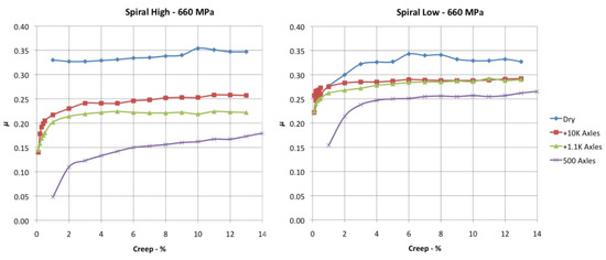 There have been no direct investigations of “retentivity” in the field as this is hard to quantify. However, creep curves were measured using the Ontrak railhead tribometer after different numbers of axle passes following the application of a TOR-FM (see Figure 16) [25]. Friction value has been replotted against cycle numbers for different slip values, as shown in Figure 17. The cycles to “dry” friction compare quite well with twin disc data [8].