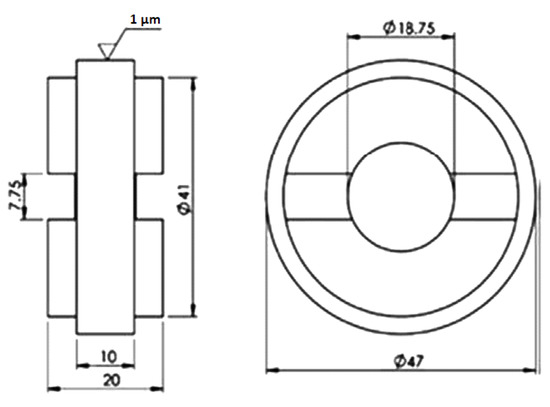 Discs should be cylinders, so a line contact is achieved. Roughness of surfaces (Ra, measured across disc contact surface, see Figure 3) should be 1 micron (consistent with run-in wheels and rails). A technical drawing of the twin disc specimen is shown in Figure 20. Roundness and centrality of the internal bore of the discs should be checked prior to testing using an appropriate measurement device, for example a Talyrond. Discs must be thoroughly cleaned before testing using a solvent such as acetone and an ultrasonic bath for 10 min to remove oil residue from the manufacturing process. Discs should be mounted on the test rig without being touched once cleaned. Discs should not be re-used unless regrinding them to return to the original roughness, since friction and product performance is very sensitive to roughness.