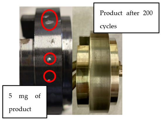 A series of “drops” making up the required amount of product (spread over four product application locations in this situation, but this may vary due to product viscosity) should be applied and then the discs should be carefully rotated at a low speed and low slip to “spread” the product evenly around the disc. If product is applied in only one location, it can be squeezed out of the contact and the discs should be observed after the product is spread to ensure that this has not occurred. An image of 5 mg applied in small drops, as shown in Figure 21. For “on-board” application the amount would be significantly lower. This would require a spray or atomisation of the product depending on the actual field application method.