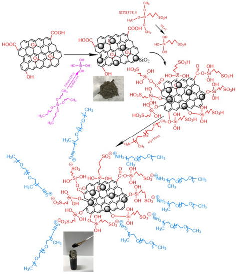 To begin with, 500 mg GO@SiO2 was dispersed in 10 mL deionized water under sonication to obtain the GO@SiO2 suspension, followed by dropwise adding 5 mL SIT8378.3 solution and stirring for 30 min. Then, the NaOH solution (1 mol L−1) was added until the pH became 7, and the solution was stirred at room temperature for 24 h. In order to remove the residual SIT 8378.3, the solution was dialyzed using a dialysis tube for 48 h and the deionized water was exchanged every 8 h. Next, a cation exchange resin was employed to remove the Na+ ions to protonate the sulfonate group. Finally, the polymer chains were attached onto the functionalized GO@SiO2 compound by dropwise injecting 10 wt.% Jeffamine M-2070 solution to neutralize all sulfonate groups connected to the surface of the GO@SiO2 compound. Finally, the solution was dried to a constant weight under vacuum at 50 °C, and the nanoscale liquid-like GO@SiO2 hybrid was obtained. A synthetic framework is illustrated in Figure 1.