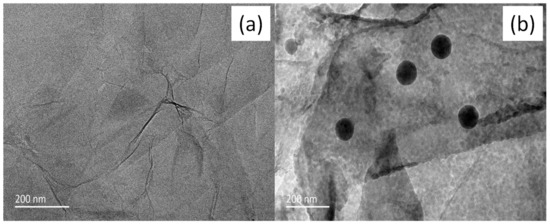 The microstructures of the GO and GO@SiO2 compounds were characterized by TEM, as shown in Figure 2. Figure 2a reveals that the GO nanosheets were efficiently exfoliated to form separate and transparent sheets. In addition, the dark color in the picture indicates that the GO nanosheets were folded. Compared with the GO (Figure 2a), the GO@SiO2 compound was decorated with SiO2 nanoparticles with a diameter of approximately 100 nm, in which the SiO2 nanoparticles were sparsely attached onto the lamellae of GO, displaying no apparent nano-SiO2 agglomeration.