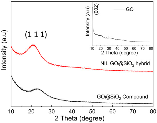 The crystalline structures of GO, the GO@SiO2 compound and the NIL GO@SiO2 hybrid were analyzed by XRD. As shown in Figure 3, the diffraction of the GO peaks occurred at 2θ = 11.4°, corresponding to the (0 0 2) plane. In addition, the characteristic diffraction peak at 2θ = 22° can be assigned to the (1 1 1) plane reflection of SiO2 according to PAN-ICSD NO.01-089-3435, which suggests that SiO2 nanoparticles were successfully attached to the GO. Moreover, the XRD pattern of the NIL GO@SiO2 hybrid revealed that GO@SiO2 compounds retain their structural and size integrity after surface functionalization.