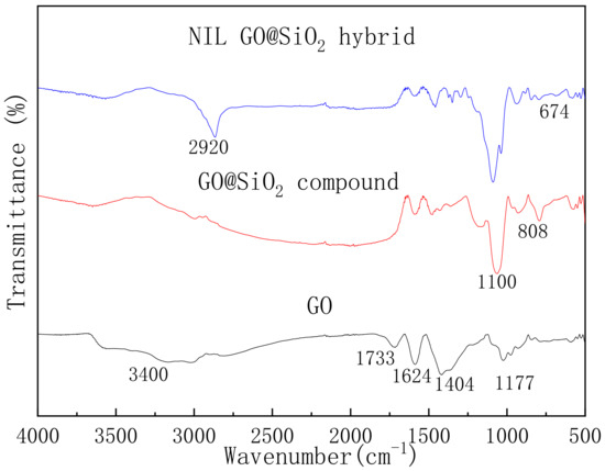 The FTIR spectra of GO, the GO@SiO2 compound, and the NIL GO@SiO2 hybrid are presented in Figure 4. The FTIR spectrum of GO reveals the presence of hydroxyl (~3400 cm−1), epoxy (~1177 cm−1), carboxyl (~1733 cm−1), the O-H deformation (~1049 cm−1), and the oxygenous groups (~1624 cm−1) [46]. The intensities of these IR peaks dropped considerably after the attachment of the silica nanoparticles. In addition, the characteristic absorption peaks of Si-O (~1105 cm −1) and Si-O-Si (~1100 cm−1) were both observed, which confirms that silica was successfully deposited on the surface of the GO. As for the NIL GO@SiO2 hybrid, the bands at ~2920 cm−1 and 674 cm−1 were due to the C-H vibrations from the Jeffamine M-2070 and SO32− from SIT 8378.3, respectively. Owing to the relatively small number of terminal ammonium groups present in the high molecular weight of the the Jeffamine M-2070, it is difficult to detect them in the FTIR spectra [47].