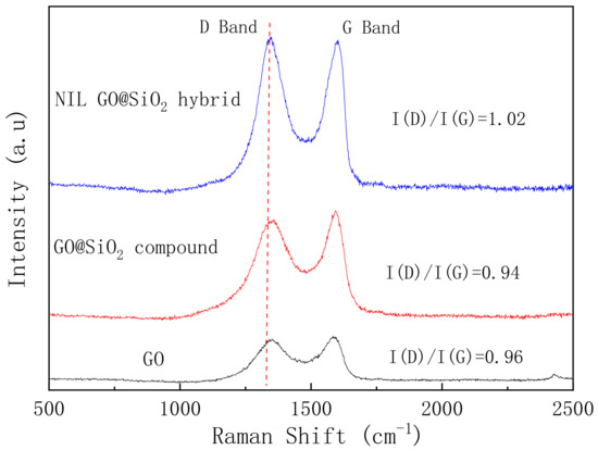 To further investigate the layered and defect structure of carbonaceous materials, Raman spectroscopy was employed to explore the GO, the GO@SiO2 compound and the NIL GO@SiO2 hybrid. As shown in Figure 5, two bands around 1350 cm−1(D) and 1595 cm−1 (G) represent the disorder of symmetry and crystallization, respectively [48], and are attributed to the activation of the first-order scattering process of sp3 carbon and sp2-bonded carbon atoms in graphene sheets, respectively. The ratio of the D-band and G-band I(D)/I(G) is correlated to the ratio of disordered sp3 and ordered sp2 carbon domains. The higher the ratio of the D-band to G-band, the more defects in the carbon materials. Compared with GO (ID/IG = 0.96) and the GO@SiO2 compound (ID/IG = 0.94), the NIL GO@SiO2 hybrid increased to 1.02, implying that the sp2 carbon domain decreased and new defects and polar groups were produced. In addition, the molecular charge transferred between M-2070 and the graphene also led to the increase in the I(D)/I(G) ratio [43].