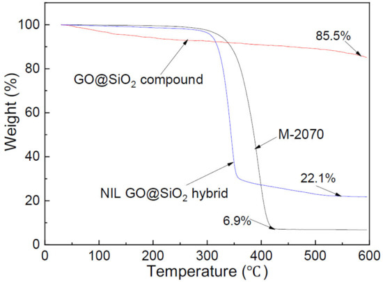 Figure 6. TGA curves of M-2070, GO@SiO2 compound and NIL GO@SiO2 hybrid.