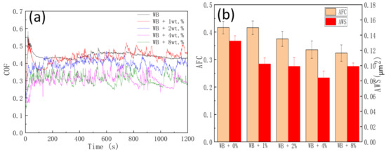 Figure 8. (a) COF versus time and (b) AFC and AWS lubricated by different concentrations.