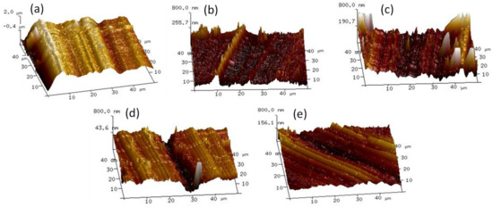 Figure 9. AFM images of wear tracks lubricated by (a) the WB lubricant, (b) 1.0 wt.%, (c) 2.0 wt.%, (d) 4.0 wt.%, and (e) 8.0 wt.% NIL GO@SiO2.