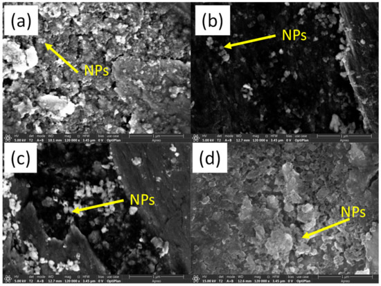 In order to understand the mechanisms of friction reduction and anti-wear for the NIL GO@SiO2 hybrid, FE-SEM morphologies of the worn track lubricated under the different concentrations are displayed in Figure 10. Spherical nanoparticles can be discerned at all concentrations; these are the silica nanoparticles attached to the GO. The friction reduction was less obvious at low concentrations (1.0 wt.% and 2.0 wt.%), because there were limited nanoparticles deposited on the mating surfaces (Figure 10a,b). When the concentration increased to 4.0 wt.% and 8.0 wt.%, both friction reduction and anti-wear were reduced more than 20%. Furthermore, the shape and size of the nanoparticles were well maintained after the wear tests, which implies that the NIL GO@SiO2 hybrid may have a typical micro-bearing effect in common cases [52]. Moreover, graphene also promotes relative sliding between the mating surfaces.