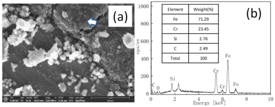 FE-SEM image of the wear track lubricated by the 4.0% NIL GO@SiO2 hybrid and a point element analysis are given in Figure 11. The spherical particles (bright color) can be discerned, and the EDS spectra analysis (Figure 11b) reveals Si (wt.% 2.76) and C (wt.% 2.49) elements on the worn track, which illustrates that the NIL GO@SiO2 hybrid was embedded onto the steel substrate under high contact pressure. This indicates that the spherical SiO2 nanoparticles in the lubricant can roll between the rubbing surfaces during the friction process. The graphene deposited onto the rubbing surfaces also plays a role in anti-wear and friction reduction. At the later stage, the hybrid could take effect and avoid the direct steel-to-steel contact to reduce wear. In future, more exquisite techniques (focused ion beam—FIB) should be applied to characterize the lubrication films formed due to nanoparticles. Furthermore, Bao and our former findings [24,53] demonstrate that there is no chemical reaction of SiO2 nanoparticles in the tribofilms, and the lubrication effect is only a physical effect.