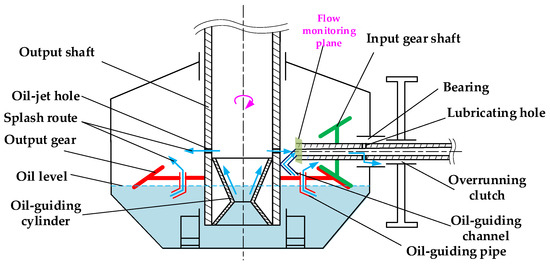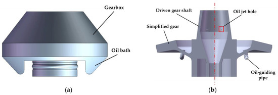 - Jiang, Y.; Hu, X.; Hong, S.; Li, P.; Wu, M. Influences of an oil guide device on splash lubrication performance in a spiral bevel gearbox. Tribol. Trans. 2019, 136, 155–164. [Google Scholar] [CrossRef]
