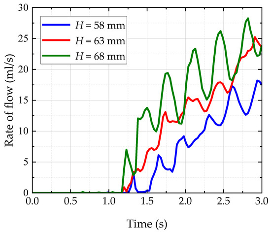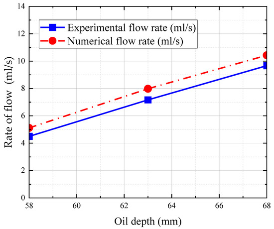 | Oil Depth H (mm) | Running Time (min) | Experimental Flow Rate (mL/s) | Baseline Testing Flow Rate (mL/s) | Numerical Flow Rate (mL/s) | Relative Error |