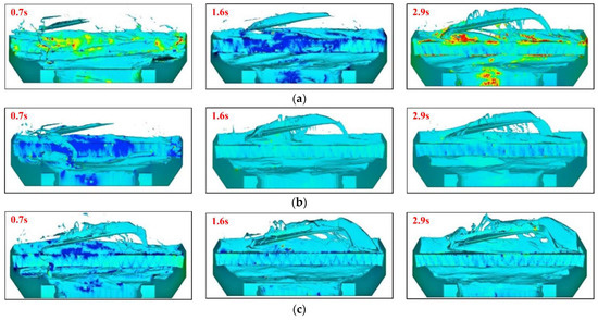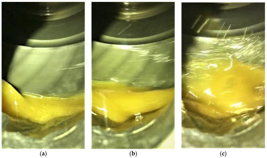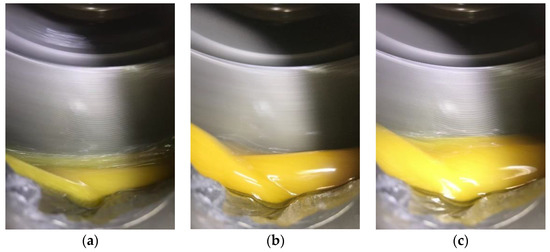 - By leveraging the oil-guiding channel, the oil mass transferred from the gear surface into the channel increases, and then the oil volume collected through the oil-collecting pipe also increases. Specifically, at the rotating speed of 400 rpm, the oil flow rate with the oil-guiding channel in this study exceeds 2.5 mL/s, far more than the experimental data of 0.0017 mL/s, conducted by Yin et al. [27,28]. At the rotating speed of 660 rpm, the oil flow rate with the oil-guiding channel exceeds 22.6 mL/s, much greater than the experimental data of 0.034 mL/s, performed by Yin et al. [27,28]. This shows the oil flow rate is increased by about three orders of magnitude, benefiting from the oil-guiding channel. Therefore, the oil-leading hood can effectively increase the flow rate and improve the lubrication efficiency of the whole lubrication system.