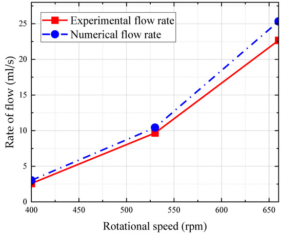 | Rotational Speed n (rpm) | Running Time (min) | Experimental Flow Rate (mL/s) | Baseline Testing Flow Rate (mL/s) | Numerical Flow Rate (mL/s) | Relative Error |