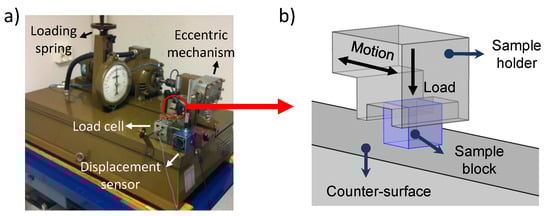 In such an experiment, a displacement sensor measures the vertical displacement of the sample block (i.e., the wear depth). The conditions are similar to those studied in []: the sample is a 4 mm cubic block that linearly reciprocates over a steel counter-surface with a stroke length of 5 mm and 0.5 Hz frequency under a constant normal load of 450 N. The nominal pressure is the load over the nominal area of 16 mm2 (i.e., 28.125 MPa).