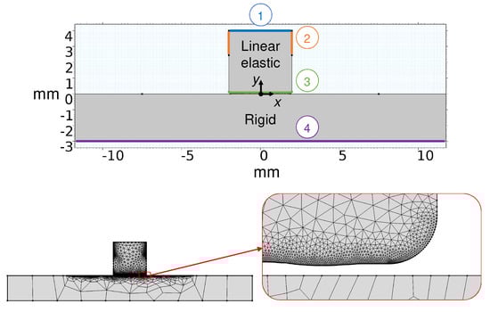 The experiment is modelled in a 2D space as shown in Figure 2. It consists of two domains: the sample block and the counter-surface. Although a faithful representation of the cubic block would require a 3D space, a 2D model is sufficient to explore the matters proposed in this work, and significantly reduces computational time. Plane strain conditions are used, and the thickness is set as 4 mm. Linear elasticity is used for the block, with Young’s modulus, Poisson’s ratio, and density of 3280 MPa, 0.39, and 1.4 g/cm3, respectively. These values are in the range of thermoplastic material commonly used as bearing material in hydropower applications []. Such materials are commonly self-lubricating, which leads to a dynamic tribosystem involving material transfer in the actual experiment, with a dynamic friction coefficient and wear rate; this aspect, however, lies outside the proposed scope of this work. The counter-surface material is a much harder steel, and therefore modelled as rigid. The lower edges of the block are filleted to resemble the sample of the experiment, which has important implications in the results, as discussed in Section 4. Referring to Figure 2, on ➀, a boundary load (450 N) is applied on the block along with a spring foundation, which acts as a temporary weak spring to prevent rigid body motion of the block while contact is being established, since the domains are initially separated. The load is applied progressively in a stationary step using a parameter that also sets the spring to zero once the total load is reached, helping the solution to converge. On ➁, rigid connectors are applied on the upper parts of the block to represent the much stiffer holder and simulate the reciprocating motion using a sine wave for the displacement in the x-direction: