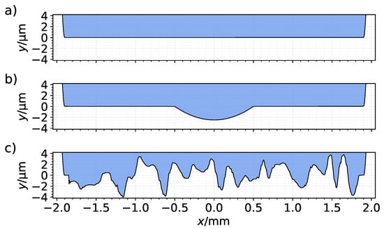 The flat surface represents the ideal nominally flat situation where the contact area of the block would equal the nominal contact area. The bumped surface contains a parabolic protuberance of 1 mm wide and a couple of micrometers in height located in the middle of the otherwise flat profile. The rough surface is a cross section from an artificially generated random isotropic 3D topography, similar to the one used in []; it is inserted between x = −1.85 mm and x = 1.85 mm and has an average roughness of 1.53 μm in this interval. The three surfaces are identical at the edges (i.e., for ).