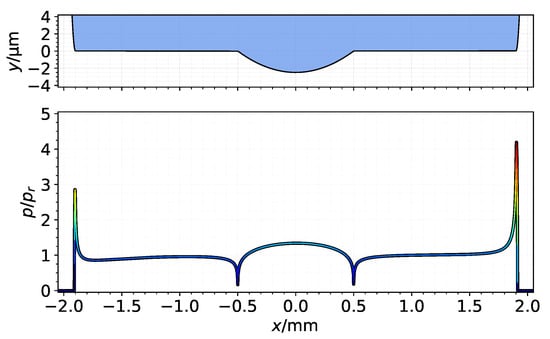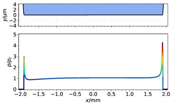 In a static and frictionless contact, the flat block resembles a flat-ended indenter as discussed by [], in which the contact pressure sharply increases towards the edges and is in fact undefined at the very edge if the corner is perfectly sharp []. Filleting the edge allows a smoother increase, but the sharp peak remains because the fillets are rather small and a true continuity between flat and rounded regions is not possible due to the discretized geometry. In case of the reciprocating block, the holder forcing the motion from the upper part of the block combined with the friction forces at the bottom of the block act in such a way as to “twist” it towards the leading edge of the movement, increasing the contact pressure at that side. Thus, the pressure distribution becomes somewhat asymmetric, with the higher pressure peak in the leading edge. Figure 4 shows the flat surface profile and corresponding contact pressure at the start of the simulations.