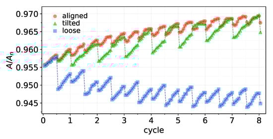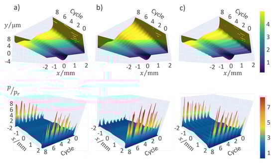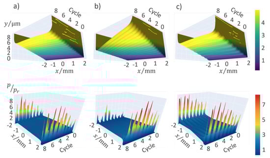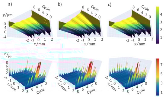 Simulations for the three surfaces under each holder condition were performed using an extrapolation factor of A = 500 and a geometry update time interval of for a total of 8 cycles. The simulation starts with the block moving to the right. If A is interpreted to represent several cycles per simulated cycle, this would correspond to a total of 4000 cycles, or 2.22 h of experiment. The nominal pressure of the experiment is used as a reference to normalize the results (i.e., ).