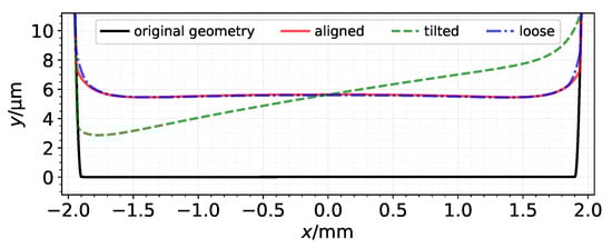 Not surprisingly, the tilted condition resulted in more wear at the side tilted towards the counter-surface (positive x values) and less at the opposite side. More surprisingly, the loose condition resulted in a very similar final geometry to that of the perfectly aligned case. This can be attributed to the compensation that occurs due to the reciprocating motion: while moving in one direction, the block is tilted towards the counter-surface at one side, and consequently wears more at that side; while returning (i.e., in the second half of the cycle), the block is tilted the other way, wearing more intensely the opposite side. A rounding of the edges is also seen in all cases, which can be attributed to the pressure peaks.