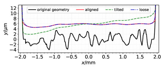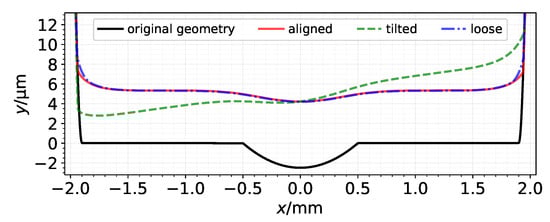 Figure 12 shows the geometry of the rough block after 8 cycles. Once again, the aligned and loose cases showed no significant difference, while the tilted situation caused the block geometry to wear preferentially at the side tilted towards the counter-surface. Despite the rough start, the geometry smooths out to such a degree that only a glimpse of the roughness remains, but it no longer causes significant changes in the pressure distribution.