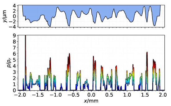 As one would expect, the highest asperities support the highest contact pressures, while some of the valleys do not even contact the counter-surface at the start. Evidently, the total area of the block contacting the counter-surface is dependent on the material properties and the external load. Since the geometry is rough, the pressure peaks at the edges due to the twist effect are not as obvious as in the previous cases, but an analysis of the static contact in comparison to when the block starts to move showed that it was indeed present, slightly increasing the pressure at the peaks of the leading edge of the block, and decreasing at the rear. The highest pressure peak at around is due to a very sharp geometry change at this position, which corresponds to the end of the rough profile; as shown in the evolution of the geometry and contact pressure in Figure 11, this and other pressure peaks vanish as the geometry smooths out.