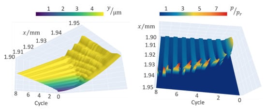 The evolution of pressure and geometry due to wear is shown in Figure 5; the “Cycle” axis can be thought of as a time axis, with each cycle corresponding to a full back and forth motion with the extrapolated wear increment.