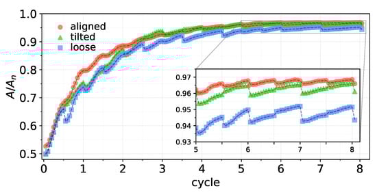 Even though the final surface of the flat block under loose conditions was previously observed to be practically the same as the aligned case after 8 cycles (Figure 6), a difference of around 0.02% can exist in the contact area between the two cases. Such difference is due to the way the edge region changes in each case. Even though such small differences can generally be considered negligible, it is important to highlight that the results of 8 extrapolated cycles presented here would correspond to an experiment lasting approximately 2.22 h and a very small misalignment of 0.5∘, whereas wear tests can last several more hours or even days, and larger or unstable misalignment can occur. Therefore, depending on the geometry and holder conditions, differences observed in each case may intensify with time and therefore become increasingly significant.