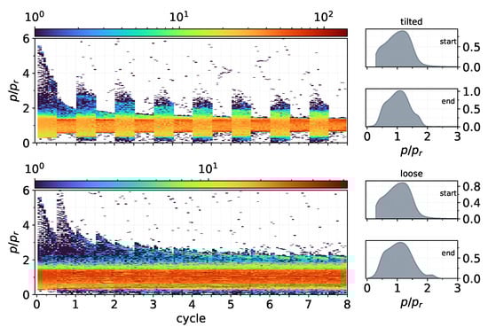 Normalized pressure frequency distribution for tilted (top) and loose (bottom) flat block throughout simulations and kernel density estimate of the start and end.