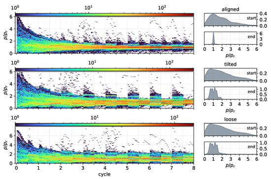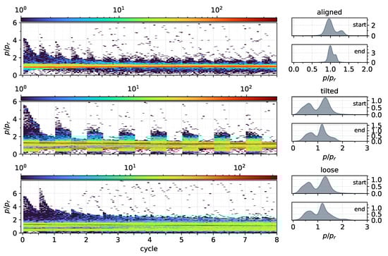 Normalized pressure frequency distribution for rough block throughout simulations: aligned (top), tilted (middle), and loose (bottom).