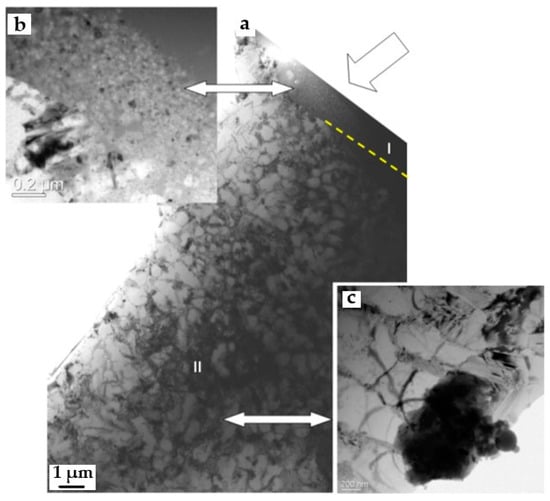The morphology of the modified layer of Al-20%Si alloy was studied by the method of transmission electron microscopy of foils prepared from the plates cut out of the bulk samples perpendicularly to the treated surface. In Figure 1, we provide the typical image of the layer structure formed after the two-stage treatment. It was established that regardless of the modification mode, a multilayer structure is formed: the surface layer (Figure 1a, layer I) and the intermediate layer (Figure 1a, layer II).