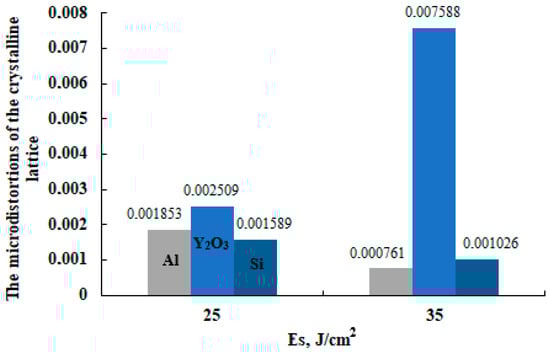 As it was mentioned above, the modified layer of Al-20%Si alloy contains yttrium oxide powder. This powder is also detected by the methods of X-ray diffraction analysis (Table 3). Its content ratio is relatively small and varies within 2.8–3.6 mass %. The lattice constant of the yttrium oxide is reduced as the energy density of the electron beam grows. Let us note that the lattice constant of yttrium oxide crystalline lattice was 1.061 nm []. The microdistortions of the crystalline lattice of yttrium oxide change significantly: they increased three times when the energy density of the electron beam grows from 25 to 35 J/cm2 (Figure 2). The microdistortions of the crystalline lattice of Al and Si phases change in the opposite way: they are reduced when the energy density of the electron beam increases.